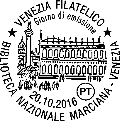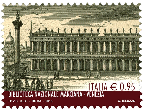 | Vignetta | il francobollo dedicato alla Biblioteca Nazionale Marciana riproduce, l’incisione di Francesco Zucchi “Veduta della Libraria Pubblica nella Piazzetta di S. Marco”, tratta dal volume “Teatro delle fabbriche più cospicue in prospettiva, sì pubbliche, che private della città di Venezia”, stampato a Venezia nel 1740 e custodito presso la Biblioteca Marciana.