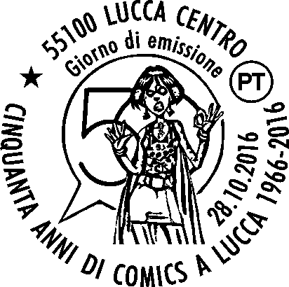 | Vignetta | raffigura, in primo piano sul logo della cinquantesima edizione della manifestazione, un personaggio femminile con una serie di fumetti tatuati sulla pelle. Completano il francobollo la leggenda “CINQUANTA ANNI DI COMICS A LUCCA 1966-2016”, la scritta “ITALIA” e il valore “€ 0,95”. |