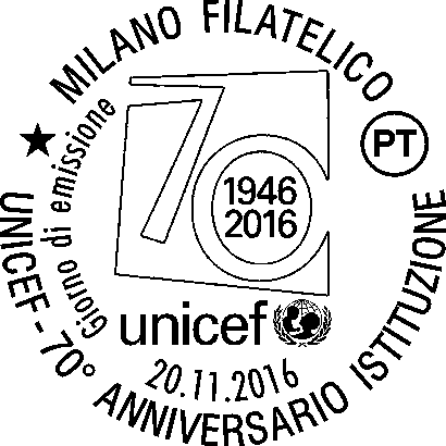 | Vignetta | riproduce il logo del 70° anniversario dell’istituzione dell’UNICEF. Completano il francobollo la scritta “ITALIA” e il valore “€ 1,00”. |