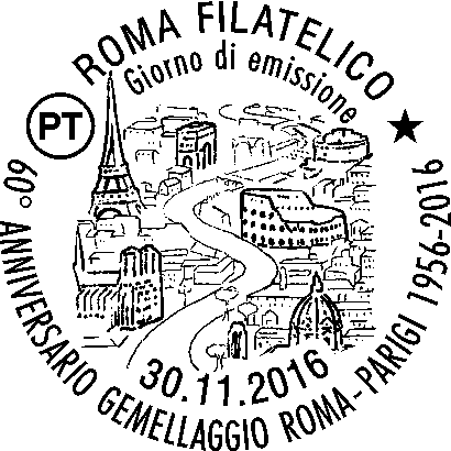 | Vignetta | raffigura una veduta ideale di Roma e Parigi, con i loro principali monumenti, sulle sponde di uno stesso fiume, simbolo del rapporto di collaborazione e amicizia che unisce le due città dal 1956. Completano i francobolli le leggende “350 ANNI DELL’ACCADEMIA DI FRANCIA IN ROMA”, “VILLA MEDICI”, e “ITALIA-FRANCIA” per il francobollo dedicato all’Accademia di Francia; “60° GEMELLAGGIO ROMA-PARIGI” e le date “1956-2016” per il francobollo dedicato al 60° Anniversario del patto di gemellaggio; la scritta “ITALIA” e il valore “€ 0,95” per ciascun francobollo |