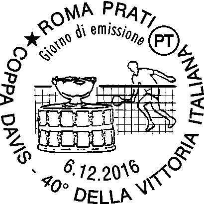| Vignetta | raffigura, a sinistra, la Coppa Davis, in primo piano su una rete da tennis e la sagoma di un giocatore. Completano il francobollo le leggende “COPPA DAVIS”, “40° DELLA VITTORIA ITALIANA” e le date “1976 2016”, la scritta “ITALIA” e il valore “€ 0,95”. |