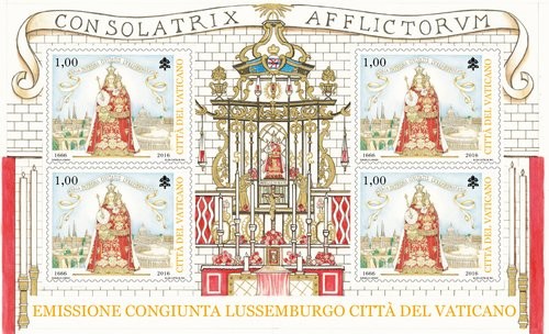 | Vignetta | L’Ufficio Filatelico e Numismatico celebra la ricorrenza con l’emissione di un minifoglio di quattro valori da un euro ciascuno, realizzato dall’artista Daniela Longo. La rappresentazione centrale dell’altare della cattedrale è affiancata dai francobolli nei quali la statua lignea è raffigurata simbolicamente nel mezzo delle vedute di piazza San Pietro a Roma e della cattedrale di Notre-Dame in Lussemburgo vista da ponte Adolphe, altro simbolo della città. |