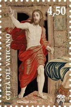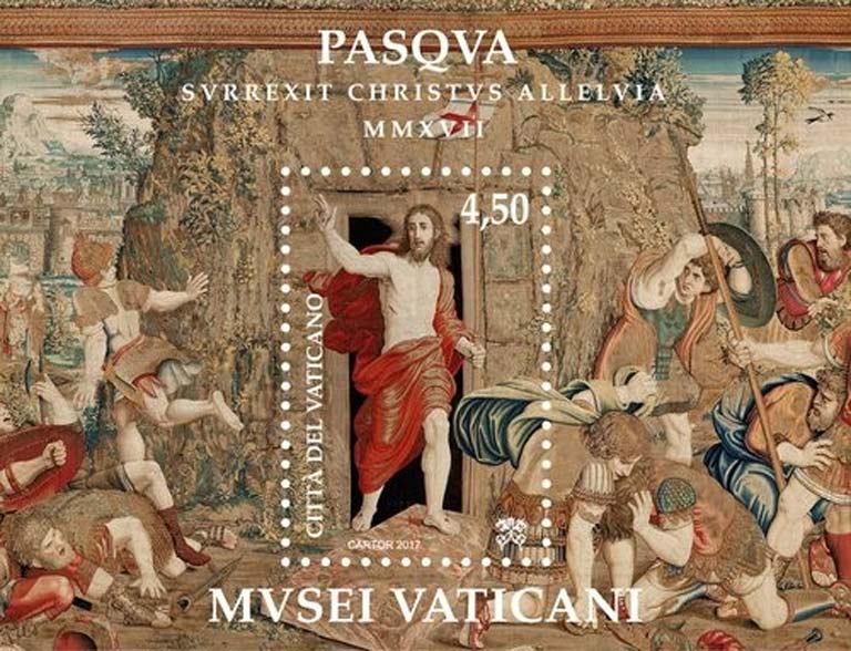 | Vignetta | L’immagine della Resurrezione che appare sul francobollo e sul foglietto è tratta un arazzo di manifattura fiamminga, conservato presso la Galleria degli Arazzi nei Musei Vaticani, eseguito dall’artista Pieter van Aelst su disegno della scuola di Raffaello. Al centro della scena Cristo risorto esce dal sepolcro stringendo con la mano destra il vessillo con la croce rossa in campo bianco, simbolo della Resurrezione. In primo piano sono rappresentati i soldati posti a guardia del sepolcro che, risvegliatesi improvvisamente dal sonno, assistono increduli ed atterriti all’evento miracoloso. |