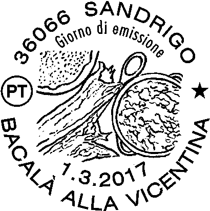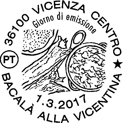 raffigura una pentola di terracotta con il “bacalà alla vicentina” affiancata da alcuni pezzi di stoccafisso e una forma di polenta. Completano il francobollo la leggenda “BACALÀ ALLA VICENTINA” , la scritta “ITALIA” e il valore “€ 0,95”.