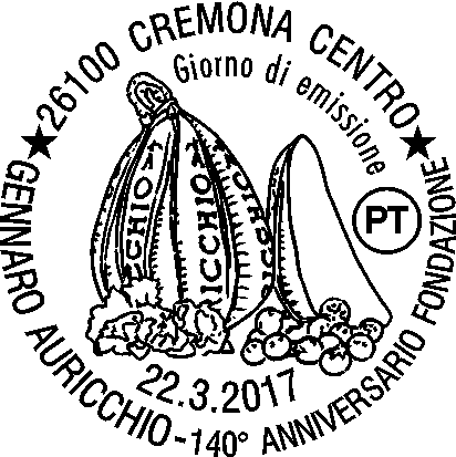 | Vignetta | raffigura una forma del provolone Auricchio affiancato da una piccola porzione con, in basso, un cespo di insalata e dei pomodorini. In alto a destra è riprodotto il logo del 140° anniversario della fondazione dell’azienda casearia. Completano il francobollo le date “1877-2017”, la scritta “ITALIA” e il valore “€ 0,95”. |