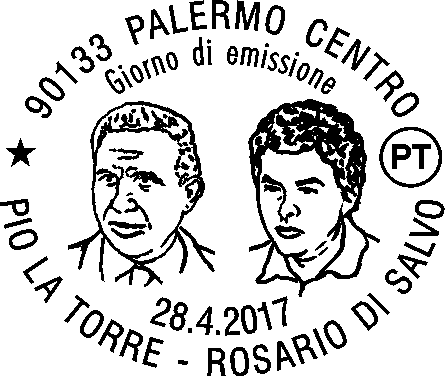 | Vignetta | raffigura, rispettivamente a sinistra e a destra, i ritratti di Pio La Torre e Rosario Di Salvo. Completano il francobollo le leggende “VITTIME DELLA MAFIA”, “1982 - 2017”, “PIO LA TORRE” e “ROSARIO DI SALVO”, la scritta “ITALIA” e il valore “€ 0,95”. |