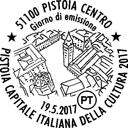 | Vignetta | raffigura una veduta aerea della Piazza del Duomo di Pistoia. Completano il francobollo la leggenda “PISTOIA - CAPITALE ITALIANA DELLA CULTURA 2017”, la scritta “ITALIA” e il valore “€ 0,95”. |