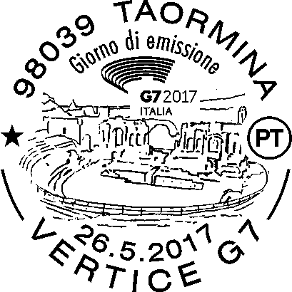 | Vignetta | raffigura il Teatro Greco di Taormina con il logo del Vertice G7, in alto a sinistra. Completano il francobollo le leggende “VERTICE G7” e “TAORMINA 26 - 27 MAGGIO”, la scritta “ITALIA” e il valore “€ 0,95”. |