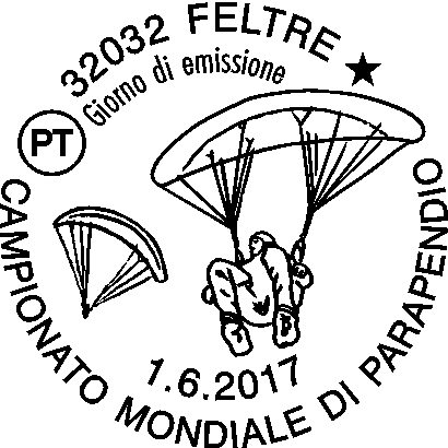 | Vignetta | delimitata in basso dal logo del Campionato Mondiale di Parapendio, raffigura un atleta impegnato in una performance sportiva. Completano il francobollo la leggenda “CAMPIONATO MONDIALE DI PARAPENDIO”, la scritta “ITALIA” e il valore “€ 0,95”. |