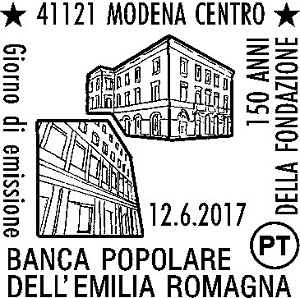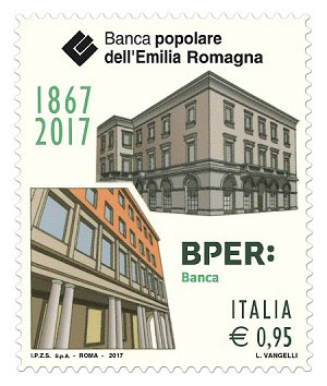 | Vignetta | raffigura la prima sede della Banca Popolare dell’Emilia Romagna, affiancata al moderno edificio che oggi la ospita. In alto e in basso sono riprodotti, rispettivamente, il logotipo della Banca Popolare dell’Emilia Romagna e il logo di BPER Banca, denominazione attuale del Gruppo.Completano il francobollo la leggenda “1867 2017”, la scritta “ITALIA” e il valore “€ 0,95”. |
