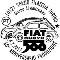 | Vignetta | il primo storico modello Fiat 500, in primo piano, e sullo sfondo, l’attuale vettura icona di casa Fiat. Alle estremità delle date sono riprodotte due bande tricolore. Completano il francobollo la leggenda “FIAT NUOVA 500”, le date “1957 2017”, la scritta “ITALIA” e il valore “ € 0,95”. |