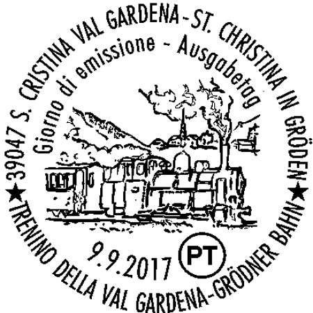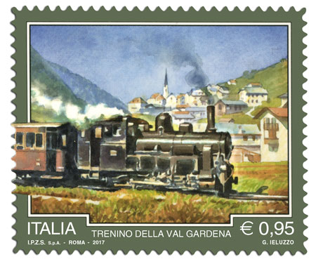 | Vignetta | raffigura il trenino della Val Gardena con il panorama di Santa Cristina Valgardena sullo sfondo. Completano il francobollo la leggenda “TRENINO DELLA VAL GARDENA”, la scritta “ITALIA” ed il valore “ € 0,95”. |