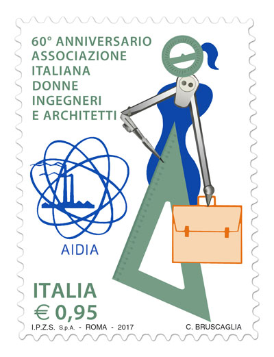 | Vignetta | n primo piano, a destra, spicca la figura di una donna composta dai principali strumenti di lavoro degli ingegneri e architetti, affiancata, a sinistra, dal logo dell’AIDIA. Completano il francobollo la leggenda “60° ANNIVERSARIO ASSOCIAZIONE ITALIANA DONNE INGEGNERI E ARCHITETTI”, la scritta “ITALIA” e il valore “€ 0,95”. |