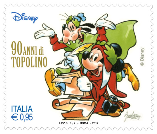 Completano i francobolli la legenda “90 ANNI DI TOPOLINO”, la scritta “ITALIA” ed il valore “€ 0,95”. |