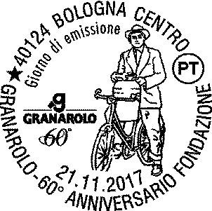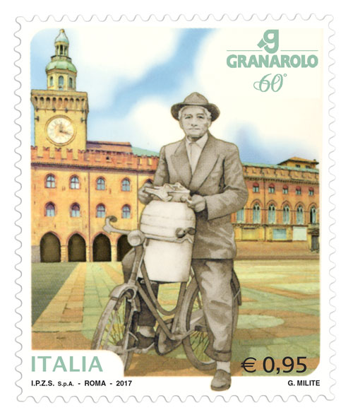 | Vignetta | raffigura, sullo sfondo di Palazzo D’Accursio, sede del Comune di Bologna, un commesso in bicicletta che trasporta, in un contenitore in metallo, il latte Granarolo.