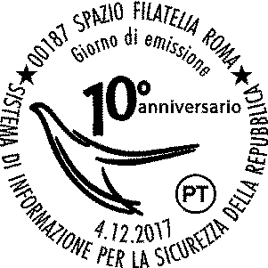 Completano il francobollo le leggende “SISTEMA DI INFORMAZIONE PER LA SICUREZZA DELLA REPUBBLICA” e “10° ANNIVERSARIO”, la scritta “ITALIA” e il valore “€ 0,95”. |