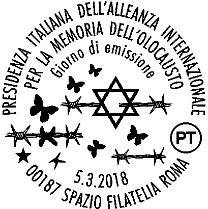 | Vignetta | su uno sfondo tricolore che richiama la bandiera italiana, si evidenziano alcuni fili spinati le cui spine si trasformano in farfalle. A destra, rispettivamente in alto e al centro, sono riprodotti la Stella di David, rappresentativa della civiltà e della religiosità ebraica, e il logo della Presidenza italiana 2018 per l’IHRA - International Holocaust Remembrance Alliance.