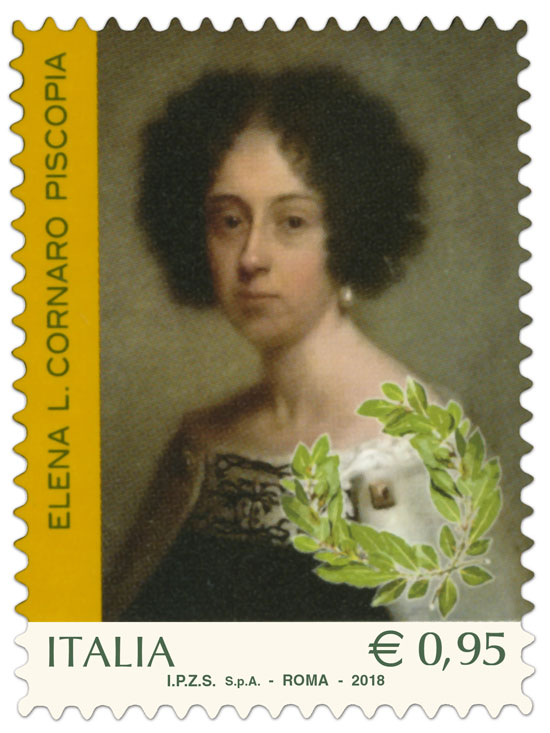| Vignetta | l’opera pittorica di Sebastiano Bombelli denominata “Ritratto di Elena Lucrezia Cornaro Piscopia”, esposta nel Museo Palazzo D’Arco in Mantova; in basso a destra, è raffigurata una corona di alloro, a rappresentare che l’illustre erudita è stata la prima donna nel mondo a conseguire una laurea; completano i francobolli le rispettive leggende “MARIA GAETANA AGNESI”, “ELENA L. CORNARO PISCOPIA”, “EVA MAMELI CALVINO”, e “ADA NEGRI”, la scritta “ITALIA” e il valore “ € 0,95”. |