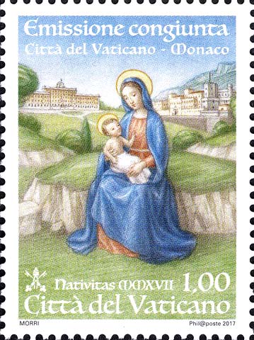 VignettaSi celebra il Santo Natale del 2017 con una serie filatelica in emissione congiunta con il Principato di Monaco, la cui realizzazione è stata affidata all’artista Stefano Morri. nel secondo l’immagine della Madonna col Bambino in primo piano domina la scena incorniciata sul fondo dal Palazzo del Governatorato della Città del Vaticano e dalla Residenza ufficiale dei Principi di Monaco.