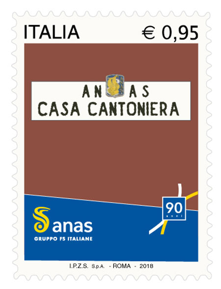 | Vignetta | raffigura la targa dell’ANAS che identifica una casa cantoniera; in basso, entro un tassello blu, colore rappresentativo dell’Azienda, sono riprodotti il logo istituzionale di ANAS e quello celebrativo del 90° anniversario dell’istituzione.