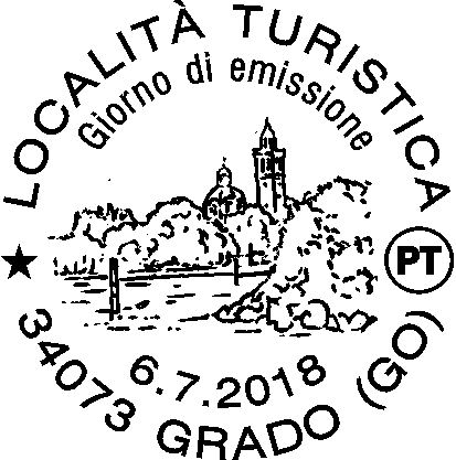 Grado: l’isola di Barbana con il Santuario della Madonna di Barbana. Completano il francobollo le leggende “GRADO”, la scritta “ITALIA” e l’indicazione tariffaria “B”. |