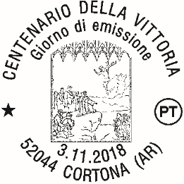 Completano il francobollo le leggende “CORTONA – OSVALDO BIGNAMI”, “AFFRESCO A RICORDO DEI CADUTI” e “CENTENARIO DELLA VITTORIA”, la scritta “ITALIA” e l’indicazione tariffaria “B”. |