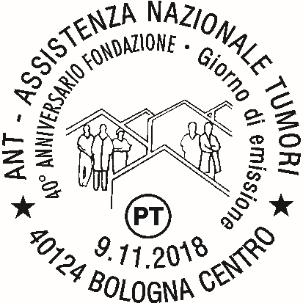 | Vignetta | Raffigura una serie di case stilizzate in alcune delle quali si stagliano profili di volontari e medici a rappresentare il sostegno, l’aiuto e la solidarietà ai malati oncologici dell’Assistenza Nazionale Tumori. In alto, a sinistra, è presente il logo del quarantesimo anniversario della fondazione dell’ANT, in basso, al centro, è riportata la frase del fondatore e Presidente onorario Franco Pannuti. “L’eubiosia è la risposta al richiamo della sofferenza, con amore”.