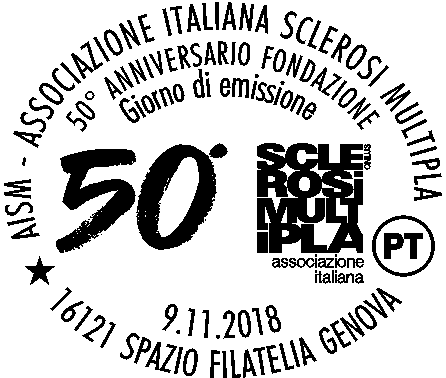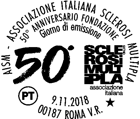 | Vignetta | Raffigura il logo del cinquantenario della fondazione dell’Associazione Italiana Sclerosi Multipla, dal 1968 il punto di riferimento più autorevole per chi è colpito la questa patologia, i familiari, gli operatori sociali e sanitari impegnati a contribuire alla risoluzione della sclerosi multipla.
