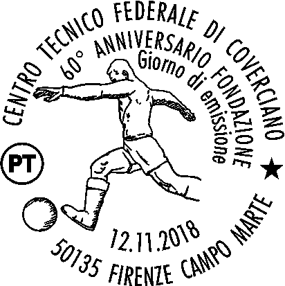 Completa il francobollo le leggende “60° ANNIVERSARIO”, “1958 - 2018”, “CENTRO TECNICO FEDERALE DI COVERCIANO”, la scritta “ITALIA” e l’indicazione tariffaria “B”. |