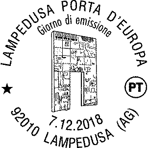 Completano il francobollo la leggenda “LAMPEDUSA PORTA D’EUROPA”, la scritta “ITALIA” e l’indicazione tariffaria “B”. |