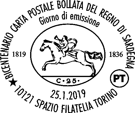 | Vignetta | riproduce, su campo rosso, una delle tre impronte riportate sulle carte postali bollate messe in circolazione nel Regno di Sardegna il 1° gennaio 1819 e in uso fino al 30 maggio 1836, differenti nel formato e nel valore in funzione della distanza e del servizio.Completano il francobollo la leggenda “BICENTENARIO DELLA INTRODUZIONE DELLA CARTA POSTALEBOLLATA DEL REGNO DI SARDEGNA”,le date “1819-1836”,la scritta “ITALIA” el’indicazione tariffaria “B”. |