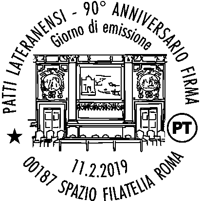 | Vignetta | riproduce la Sala della Conciliazione del Palazzo Lateranense dove l’11 febbraio 1929 vennero firmati i Patti Lateranensi tra lo Stato Italiano e la Santa Sede.Completano il francobollo le leggende “ROMA 11 FEBBRAIO 1929”,“FIRMA DEI PATTI LATERANENSI”, “SALA DELLA CONCILIAZIONE”,la scritta “ITALIA” el’indicazione tariffaria “B”. |