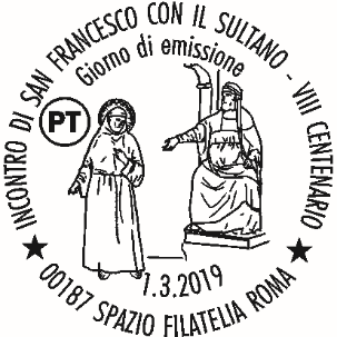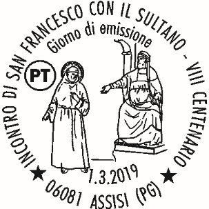 Completano il francobollo le leggende “VIII CENTENARIO”, “INCONTRO
